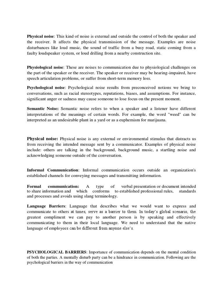 Semantic Noise In Communication : Language Barriers To Effective Communication : Problem with communication is the illusion that it has been accomplished‖ (shaw, 2011).. Four types of barriers (called ―noise,‖ see figure 1) are process barriers, physical barriers, semantic barriers, and psychosocial barriers (eisenberg, 2010). Interference in communication is often called noise. noise can be physical noise, such as a loud hallway conversation, but it can also be caused by many other sources. The semantic noise it is one of the types of noise in communication in which the person who speaks uses a complex, technical, native or grammatical language and the person who receives it does not understand said message. For example, the word weed can be interpreted as an undesirable plant in a yard or as a euphemism for marijuana. Semantic noise can interfere with communication.